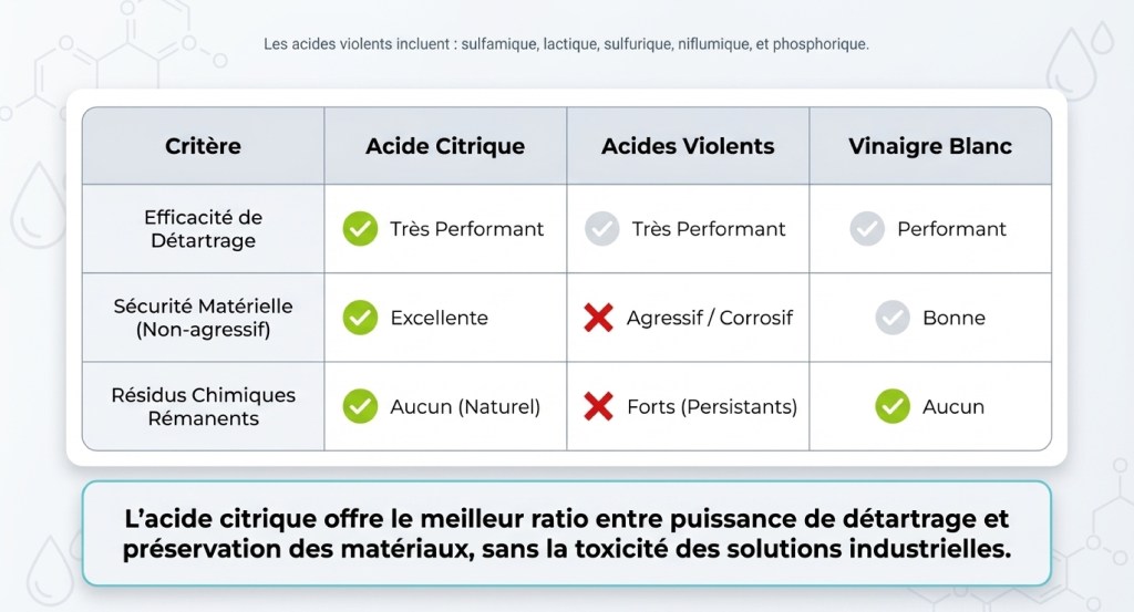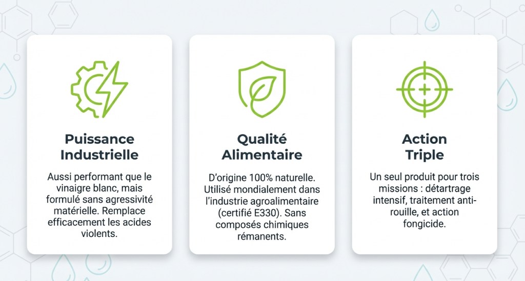 Son origine naturelle fait de lui un allié sans composés chimiques agressifs et rémanents comme la plupart des détartrants plus “violents” qui sont soit à base d’acide sulfamique , lactique , sulfurique, niflumique ou phosphorique.