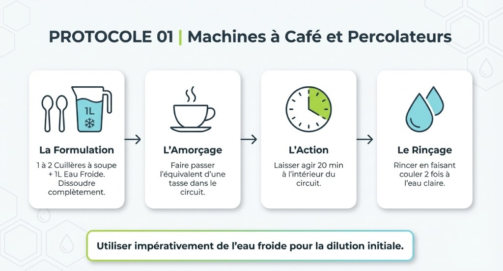 Pour le détartrage des cafetières et machines à café il faut de dissoudre 1 à 2 cuillères à soupe d’acide citrique dans 1 litre d’eau froide, de remplir le réservoir de la machine avec cette solution. Faire un passage du mélange dans la machine de la valeur en volume d’une tasse, laisser le produit agir dans le circuit une vingtaine de minutes puis rincer 2 fois à l’eau.
