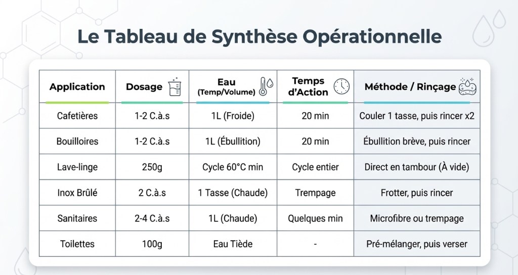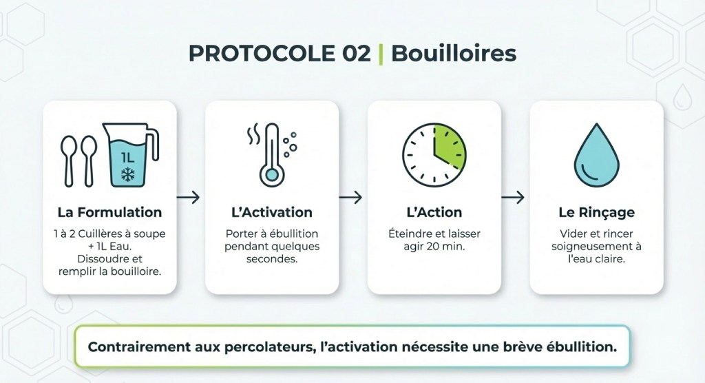 Détartrage des bouilloires : Dissoudre 1 à 2 cuillères à soupe d’acide citrique dans 1 litre d’eau, remplir la bouilloire et porter à ébullition quelques secondes , laisser agir une vingtaine de minutes. Rincer ensuite à l’eau claire,