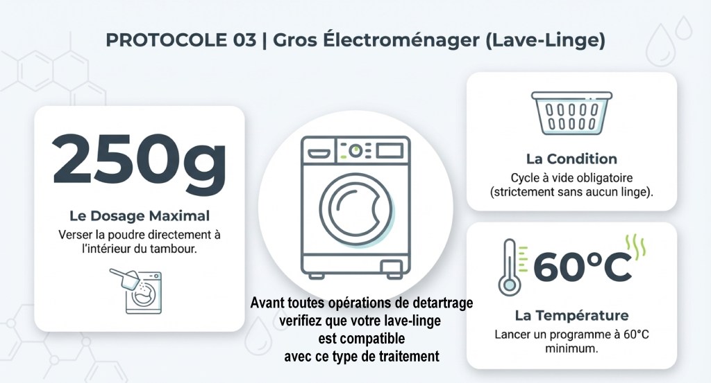 Verser 250 grammes dans le tambour et mettre sur le programme à partir de 60 degrés, sans linge bien sûr