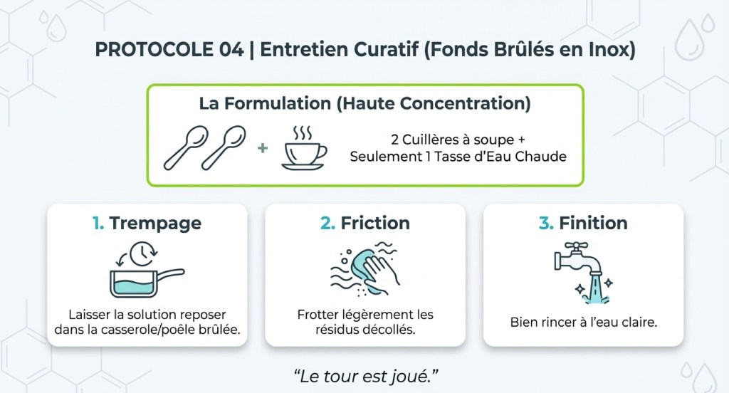 Nettoyage des fonds brûlés de casserole ou de poêle en inox : Dissoudre 2 cuillères à soupe d’acide citrique dans 1 tasse d’eau chaude laisser la solution dans la casserole brûlée quelques frotter, bien rincer le tour est joué.