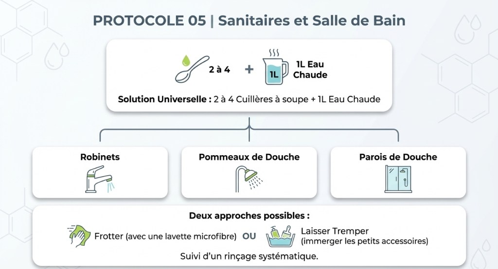 Détartrage des robinets, pommeau de douche et paroi de douche, etc… : 2 à 4 cuillères à soupe d’acide citrique dans 1 litre d’eau chaude, frotter avec une micro fibre ou les laisser tremper les accessoires quelques minutes puis rincer.