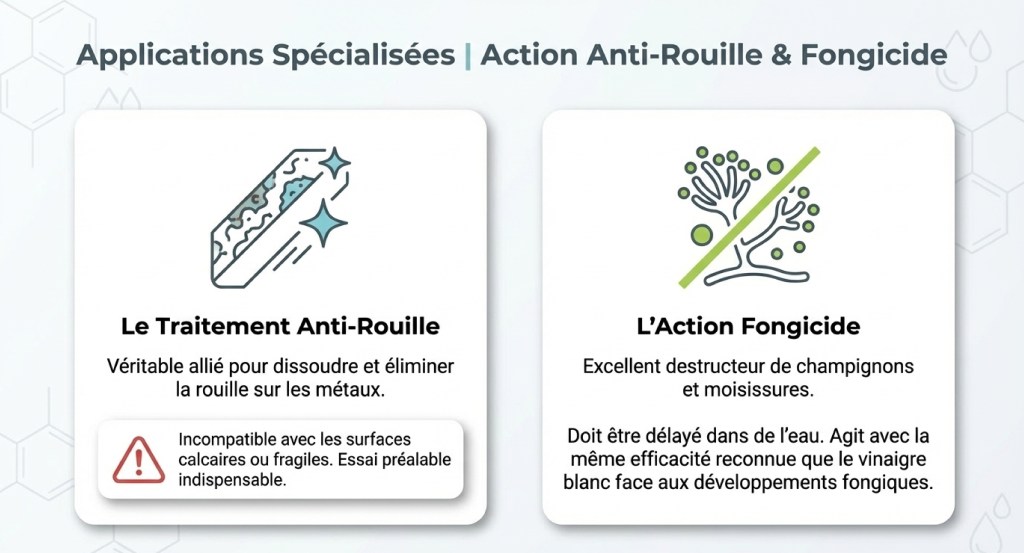 L’acide citrique est aussi un allié pour enlever la rouille sur certaines surfaces, bien entendu pas sur des surfaces calcaires ou fragiles faire un essai préalablement.