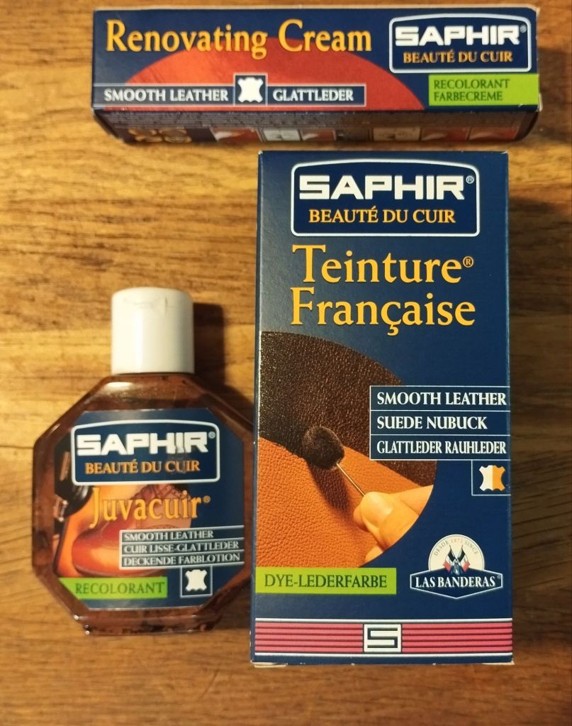Si votre cuir est affamé il est important de le nourrir avec un produit de qualité en bref un bon cirage s’il n’a pas subi de perte de couleur, un pommadier incolore suffit, en revanche si une perte de couleur du au frottement, a l’humidité ou les UV un crème colorée rattrapera.