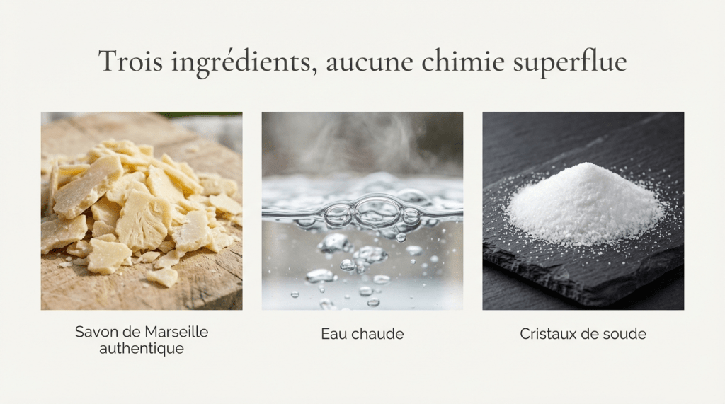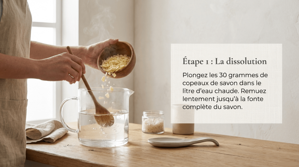 – Une trentaine a une quarantaine de grammes de savon de Marseille en paillettes, si vous n’avez pas de savon en paillettes vous pouvez râper un savon de Marseille.