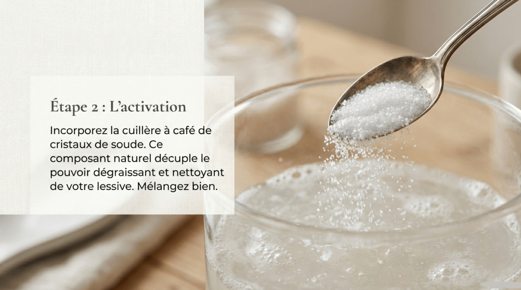 – Une demi cuillère à soupe de bicarbonate de soude ou de cristaux de soude