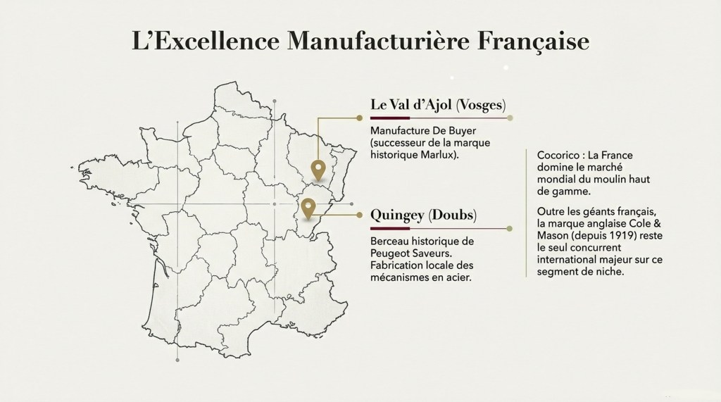 Deux sociétés françaises sont leaders sur ce marché Peugeot et De Buyer, ces marques sont fabriquées localement à Quingey dans le Doubs pour les moulins Peugeot et dans les Vosges dans le Val d’Ajol a noter que les moulins De Buyer sont les anciens moulins Marlux auparavant fabriqués en région parisienne à Montreuil