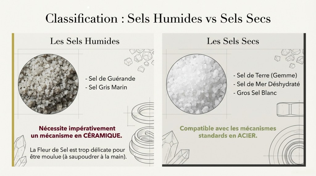Pour les sels « secs » il s’agit de sel de terre ou de sel de mer déshydraté.