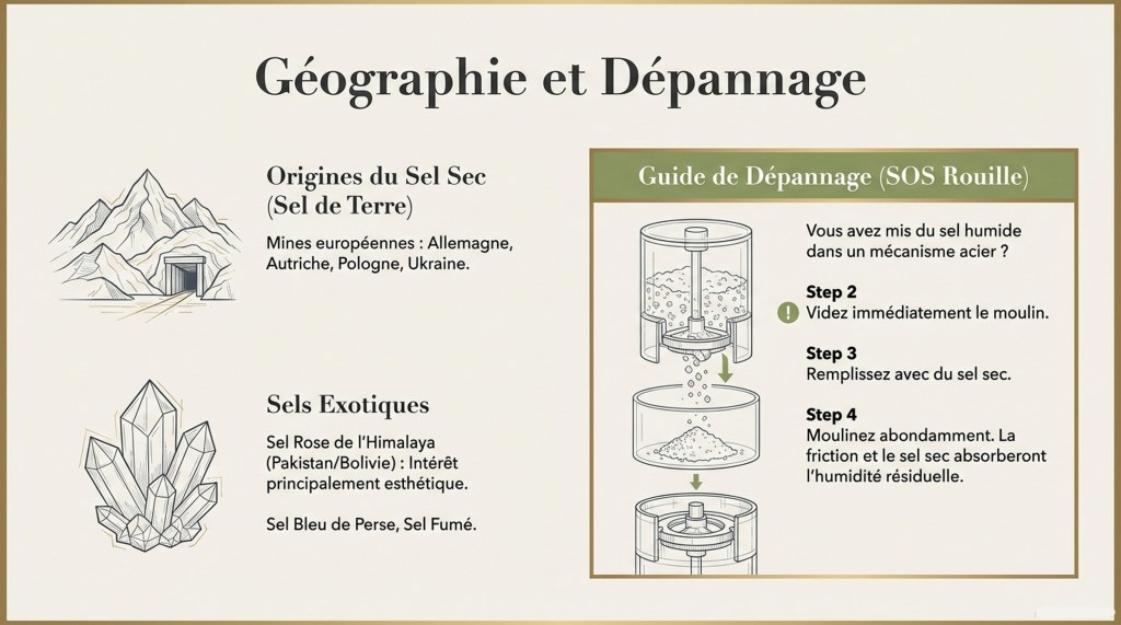 Pour les anciens modèles de moulins Peugeot avec des meules acier il est impératif de vérifier la qualité du sel. L’ emploi d’ un sel humide peu occasionner le blocage de la meule par la corrosion. C’est pour cela qu’il faire attention lors de l’achat du moulin est il compatible avec des sels de terre qui sont secs ou des sel type sel de Guérande ou gris sont généralement humides.