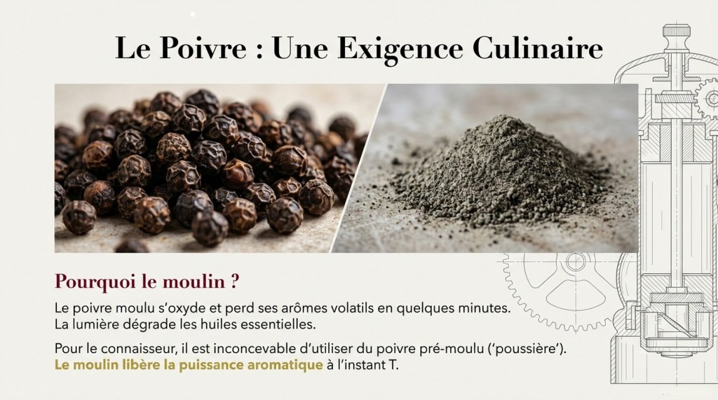 Le moulin a poivre est un basique pour les cuisiniers sérieux, en effet il est inconcevable d’utiliser du poivre déjà moulu pour un connaisseur (le poivre moulu n’est pas réputé en général pour sa qualité).
