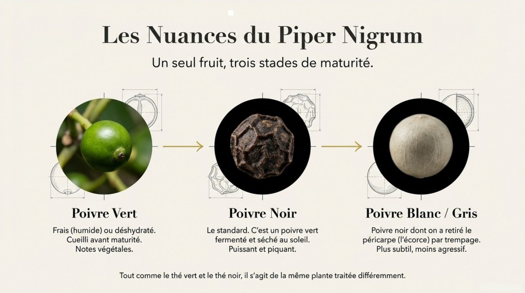 Le poivre gris est un poivre noir dont ont a enlevé la pellicule noire sur sa surface (le péricarpe).