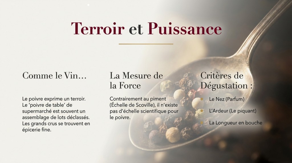 Il n’existe pas d’échelle de force pour les poivres comme pour les piments (échelle de Scoville)